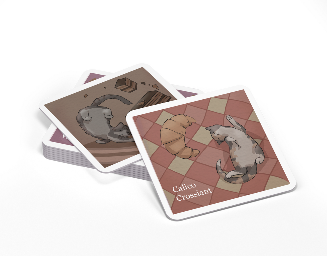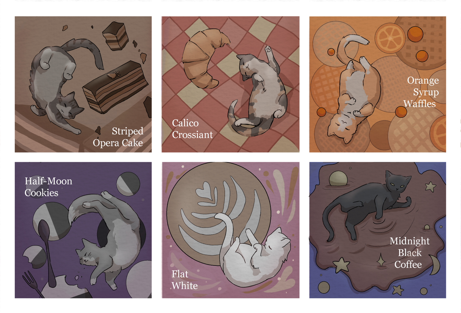 These illustrations are designed to go on disposable cardboard coasters, depicting various menu items and their matching cat.