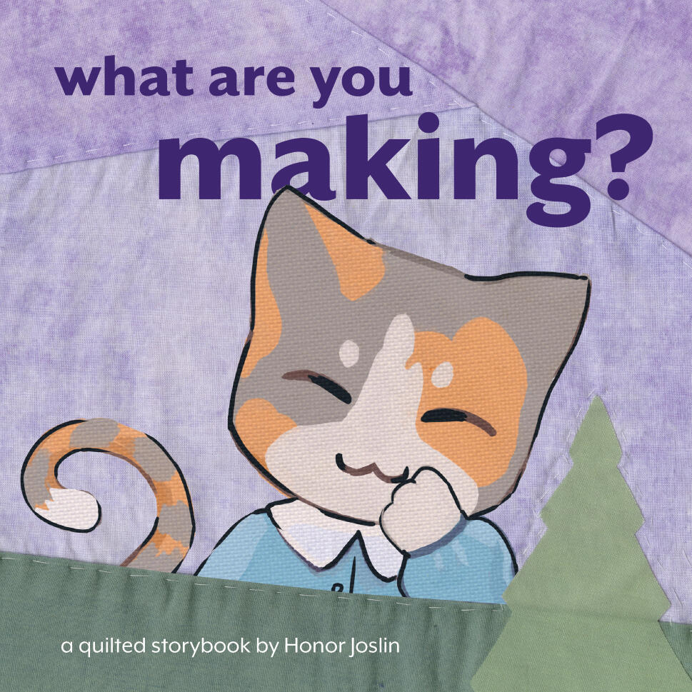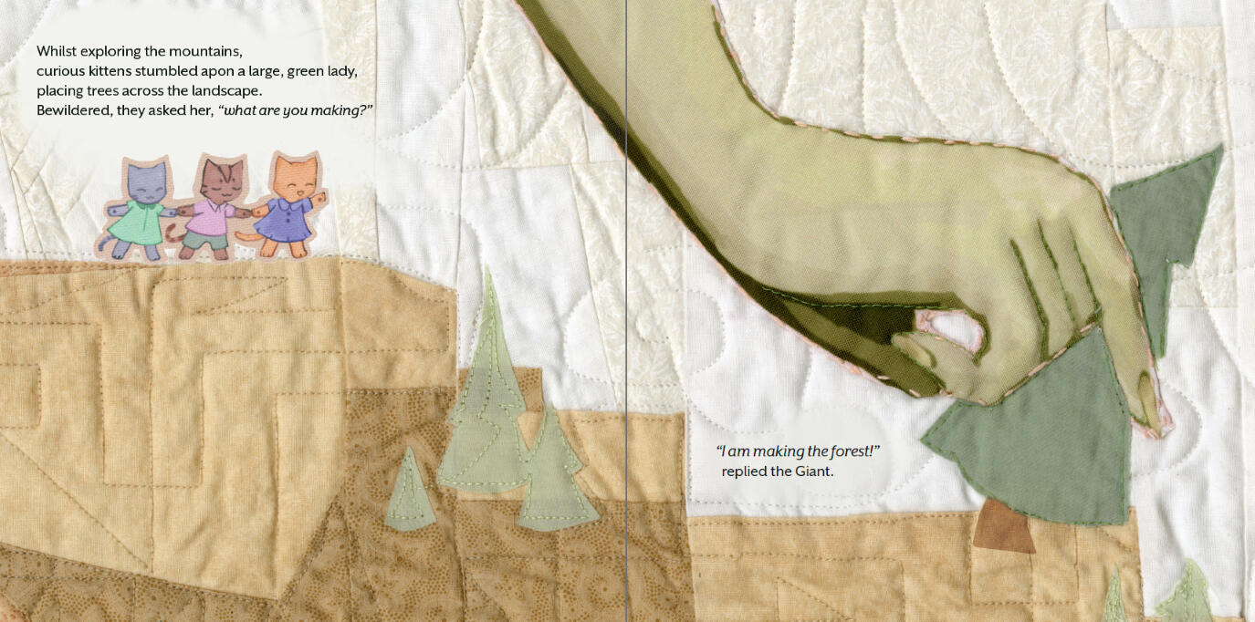 “What Are You Making?” is a children’s book constructed from a handmade quilt.We follow a group of curious kittens as they journey through their kingdom, discovering how their world was created and their role in shaping it.